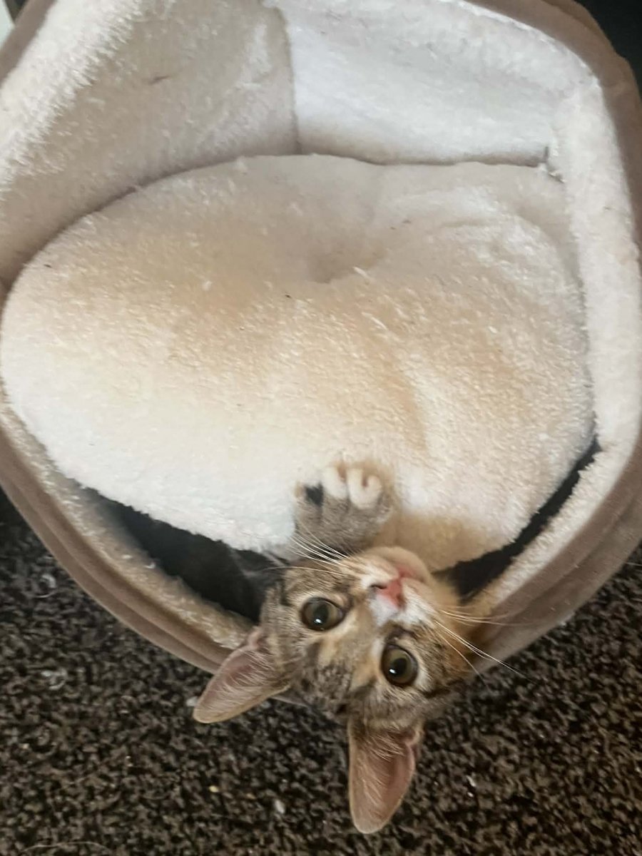Dahlia is a beautiful tabby and white girl who balances independence with affection perfectly. She enjoys having her own space, but she also loves being stroked and will happily soak up attention once she trusts you. She is very playful and full of kitten energy, always ready to chase toys or explore her surroundings.