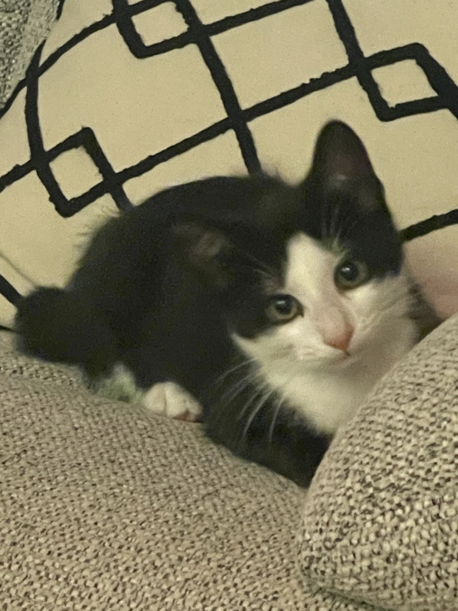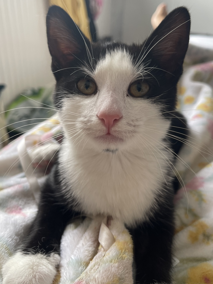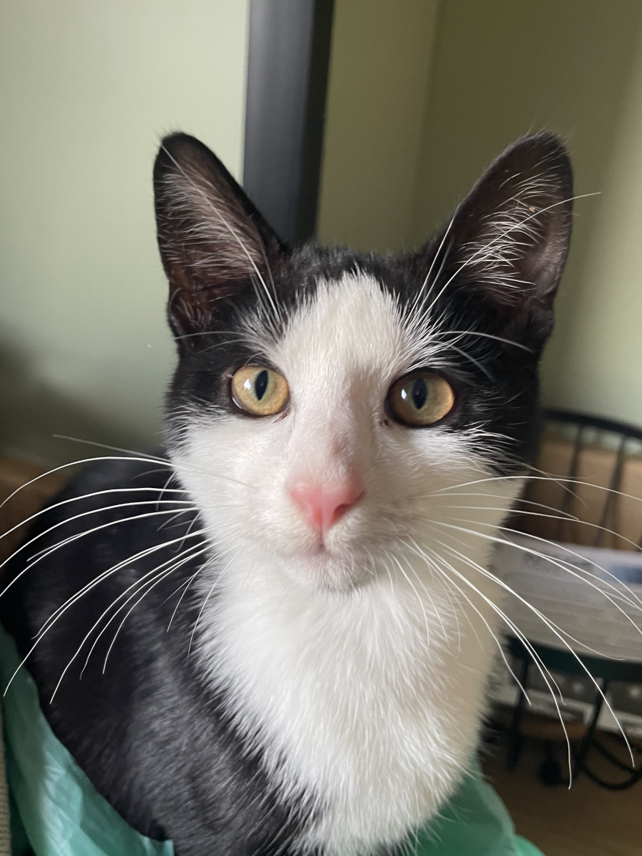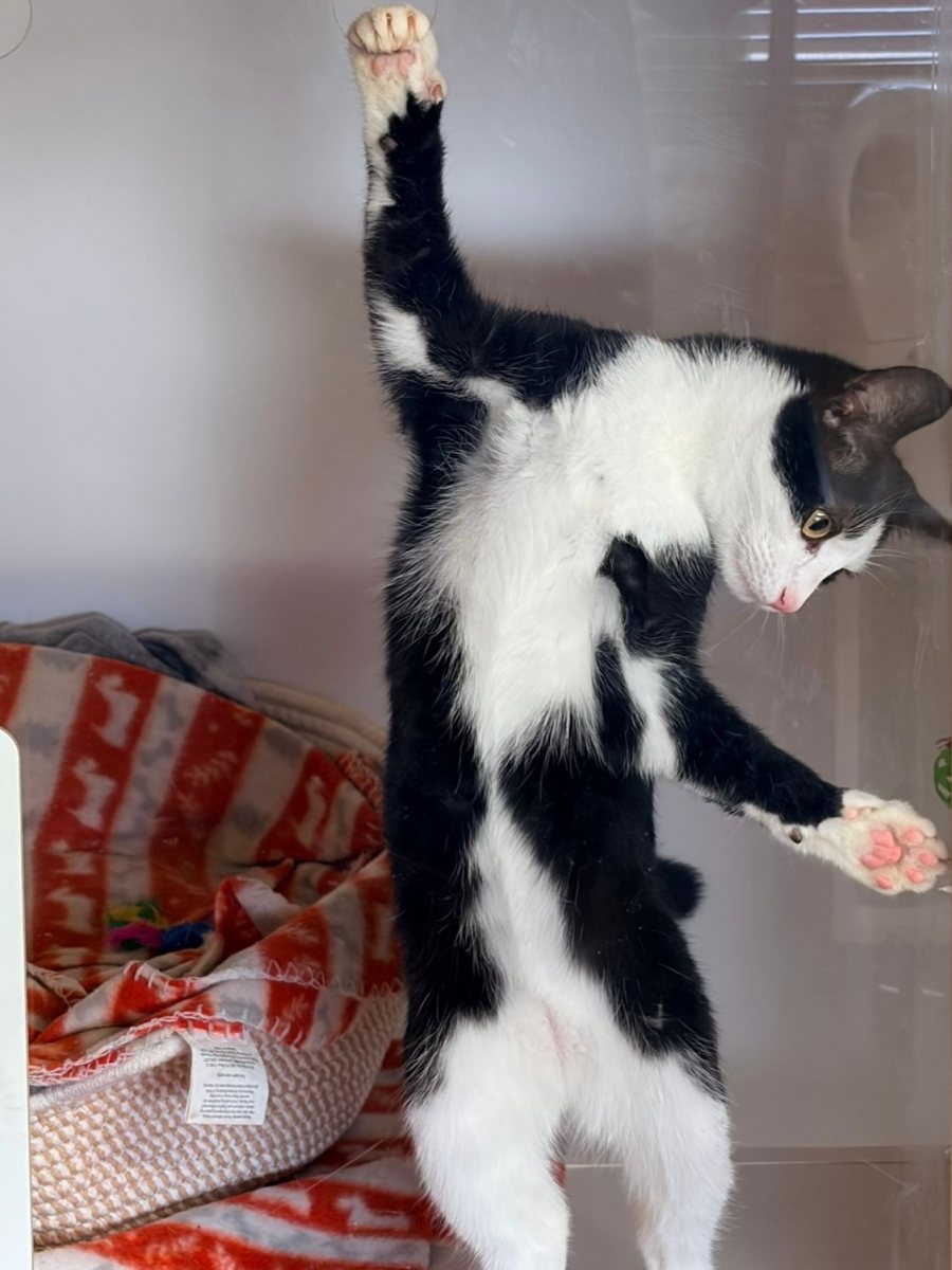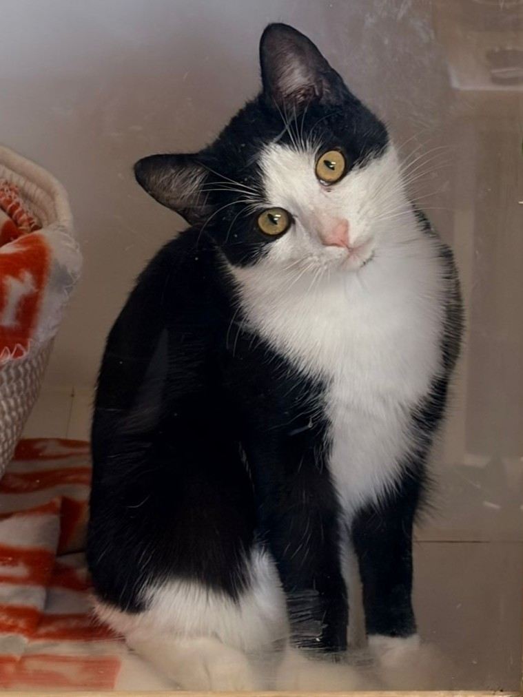 This adorable 7-month-old black and white male DSH is ready to find a family to call his own. Domino is the perfect blend of loving and playful; he’ll happily curl up for cuddles, but he’s just as excited to chase toys, explore his surroundings, and show off his kitten energy. And yes… he absolutely loves his treats!